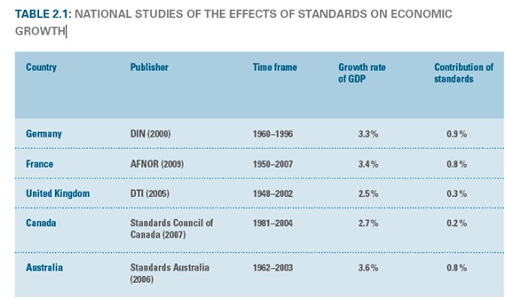 مطالعات آلمان در سال 2000 با تحليل هاي بيشتري پیگیری شد که نه تنها از رويکردهاي متدولوژيک و چارچوبهای زمانی مشابه استفاده نمود، بلکه منجر به نتايج قابل مقايسه نيز گردید. به طور کلی، تمام مطالعات ملی نشان می دهد که استانداردها به دلیلی که موجب بهبود گسترش دانش می شوند تأثیر مثبتی بر رشد اقتصادی دارند. بر اساس این مطالعات سهم استانداردها (ستون آخر در سمت راست جدول زیر) برروی نرخ رشد اقتصادی درکشور آلمان برابر با 0.9٪ ، در فرانسه و استرالیا 0.8 ٪ ، در انگلستان 0.3٪ و در کانادا 0.2 ٪ مشخص گردید.