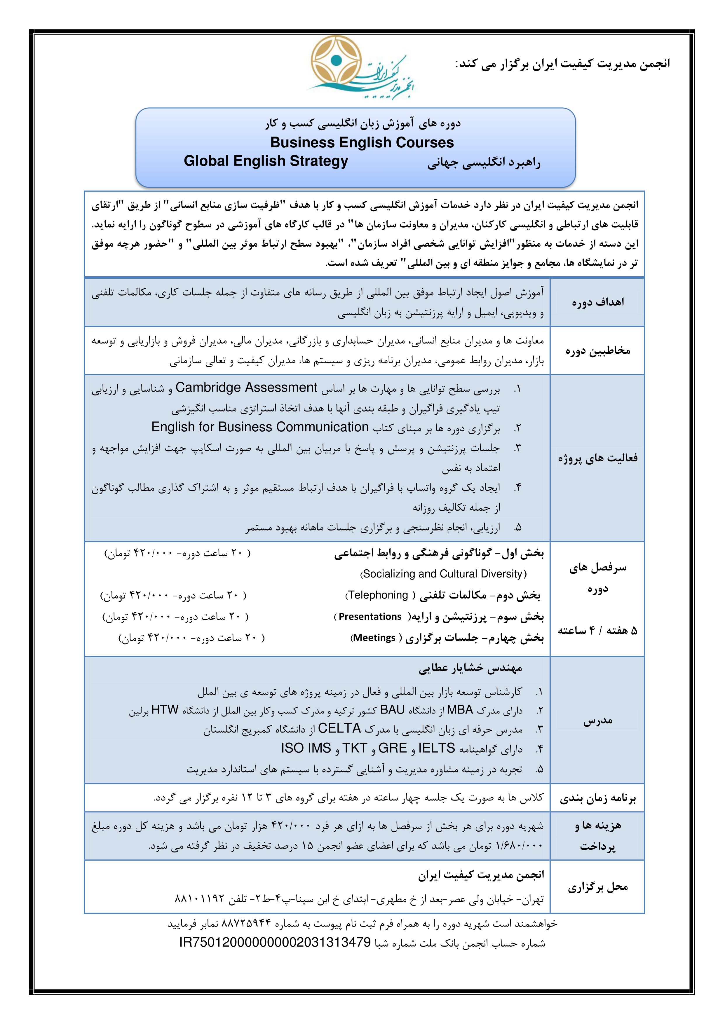 انجمن مدیریت کیفیت ایران در نظر دارد خدمات آموزش انگلیسی کسب و کار با هدف “ظرفیت سازی منابع انسانی” از طریق “ارتقای قابلیت های ارتباطی و انگلیسی کارکنان، مدیران و معاونت سازمان ها” در قالب سمینار آموزشی یک روزه را ارایه نماید. این دسته از خدمات به منظور”افزایش توانایی شخصی افراد سازمان”، “بهبود سطح ارتباط موثر بین المللی” و “حضور هرچه موفق تر در نمایشگاه ها، مجامع و جوایز منطقه ای و بین المللی” تعریف شده است. در این سمینار یک روزه شرکت کنندگان با مرور تعاریف، با منطق هر کدام از این مبانی، فواید اصلی آنها و اقداماتی که می توان در راستای بهبود آن اصول صورت داد، آشنا می گردند.
