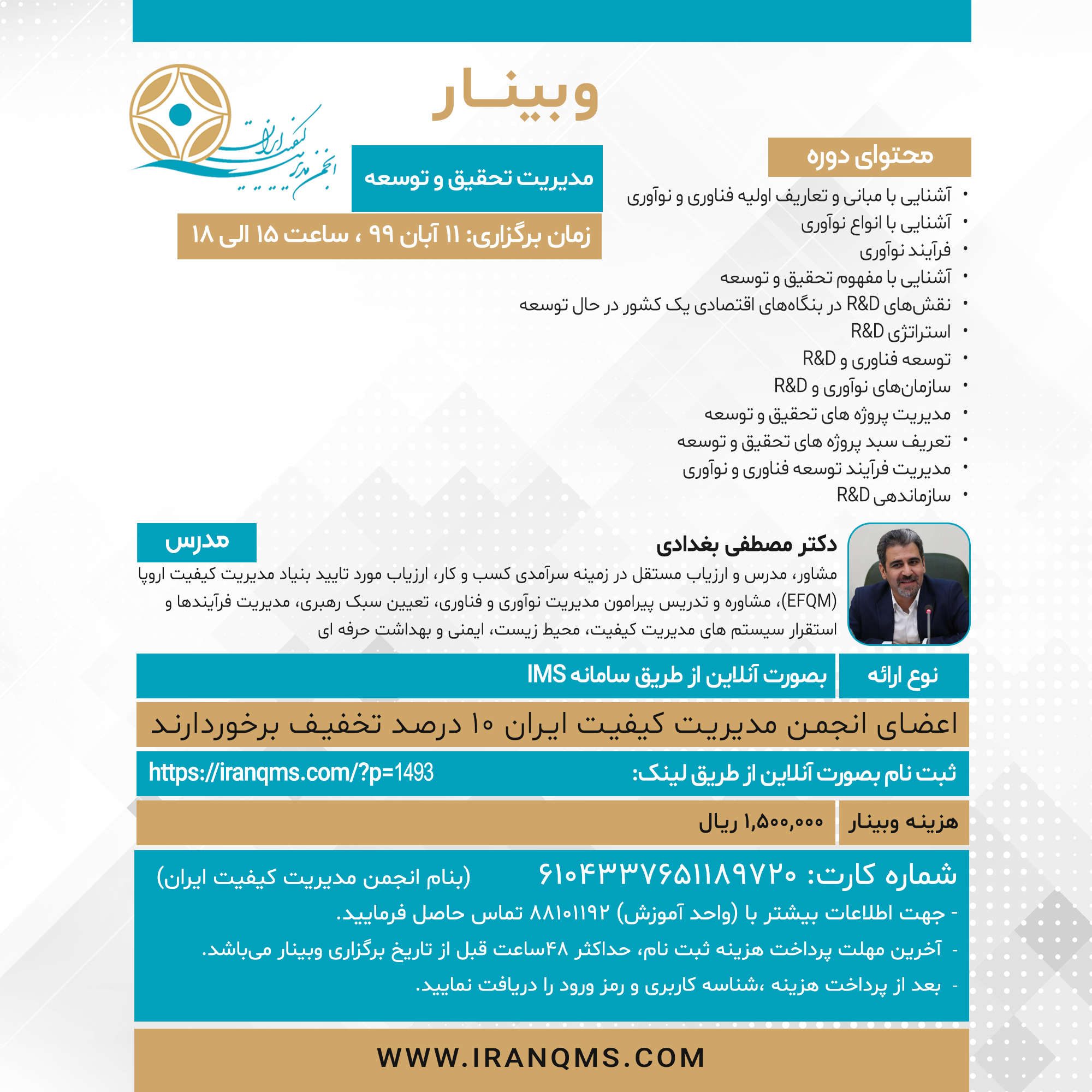 مدرس: دکتر مصطفی بغدادی، مشاور، مدرس و ارزیاب مستقل در زمینه سرآمدی کسب و کار، ارزیاب مورد تایید بنیاد مدیریت کیفیت اروپا (EFQM)، مشاوره و تدریس پیرامون مدیریت نوآوری و فناوری، تعیین سبک رهبری، مدیریت فرآیندها و استقرار سیستم های مدیریت کیفیت، محیط زیست، ایمنی و بهداشت حرفه ای.