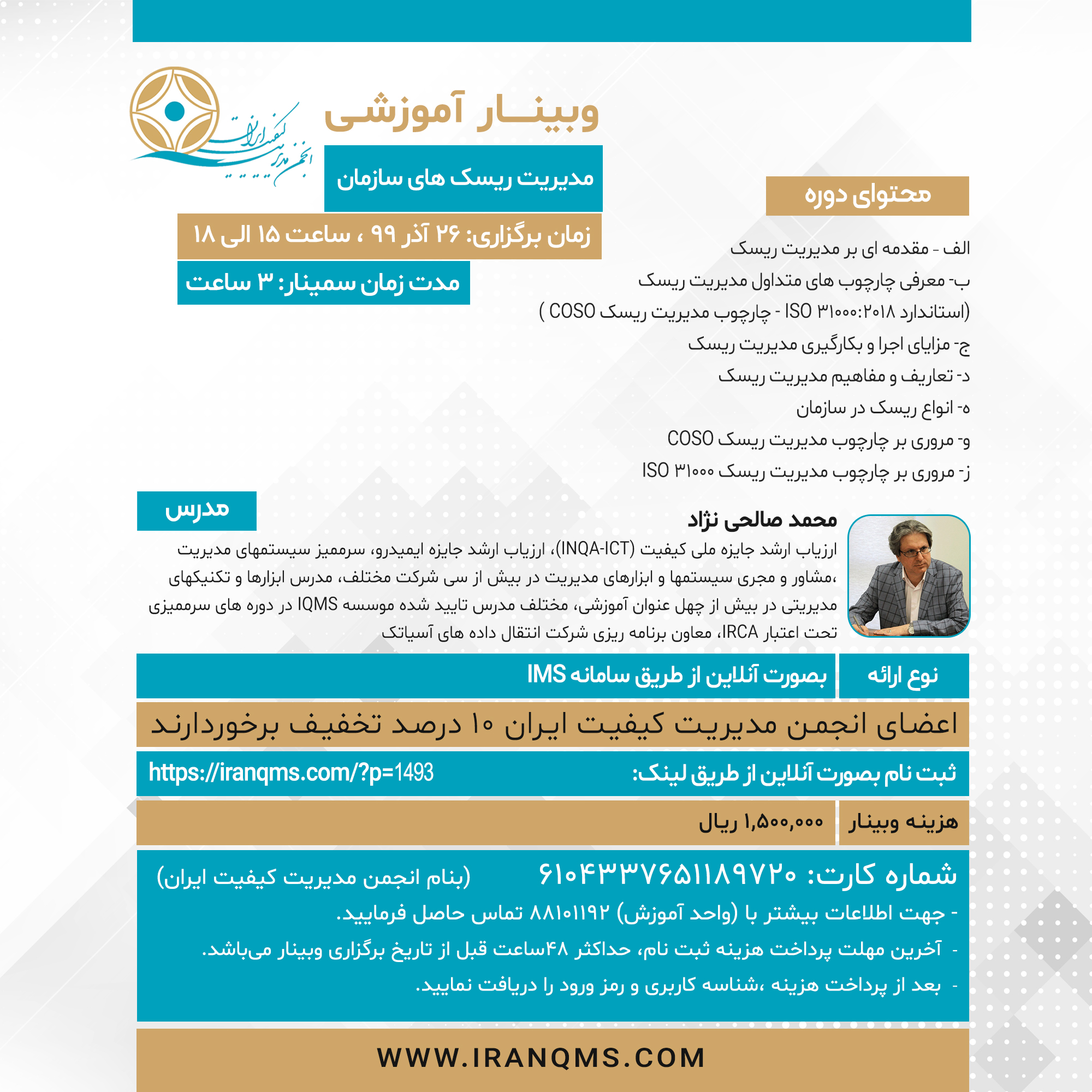 انجمن مدیریت کیفیت ایران در نظر دارد وبینار آموزشی با عنوان مدیریت ریسک های سازمان بصورت آنلاین در تاریخ 26 آذر 99 برای مدیران و کارشناسان حوزه مدیریت کیفیت و منابع انسانی و مدیران فناوری اطلاعات برگزار نماید.