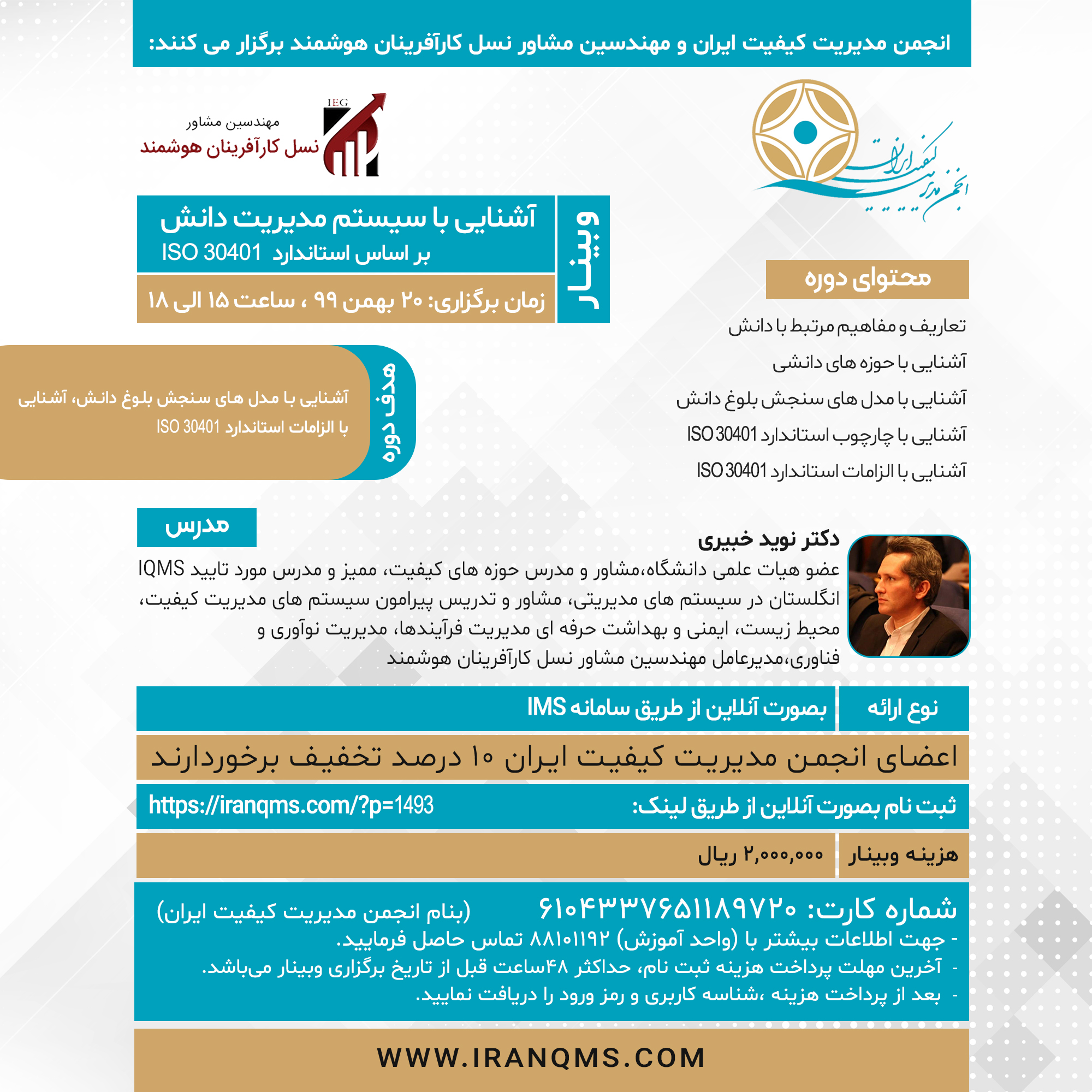 مدرس: دکتر نويد خبيري، عضو هیات علمی دانشگاه،مشاور و مدرس حوزه های کیفیت، ممیز و مدرس مورد تایید IQMS انگلستان در سیستم های مدیریتی، مشاور و تدریس پیرامون سیستم های مدیریت کیفیت، محیط زیست، ایمنی و بهداشت حرفه ای مدیریت فرآیندها، مدیریت نوآوری و فناوری،مدیرعامل مهندسین مشاور نسل کارآفرینان هوشمند
