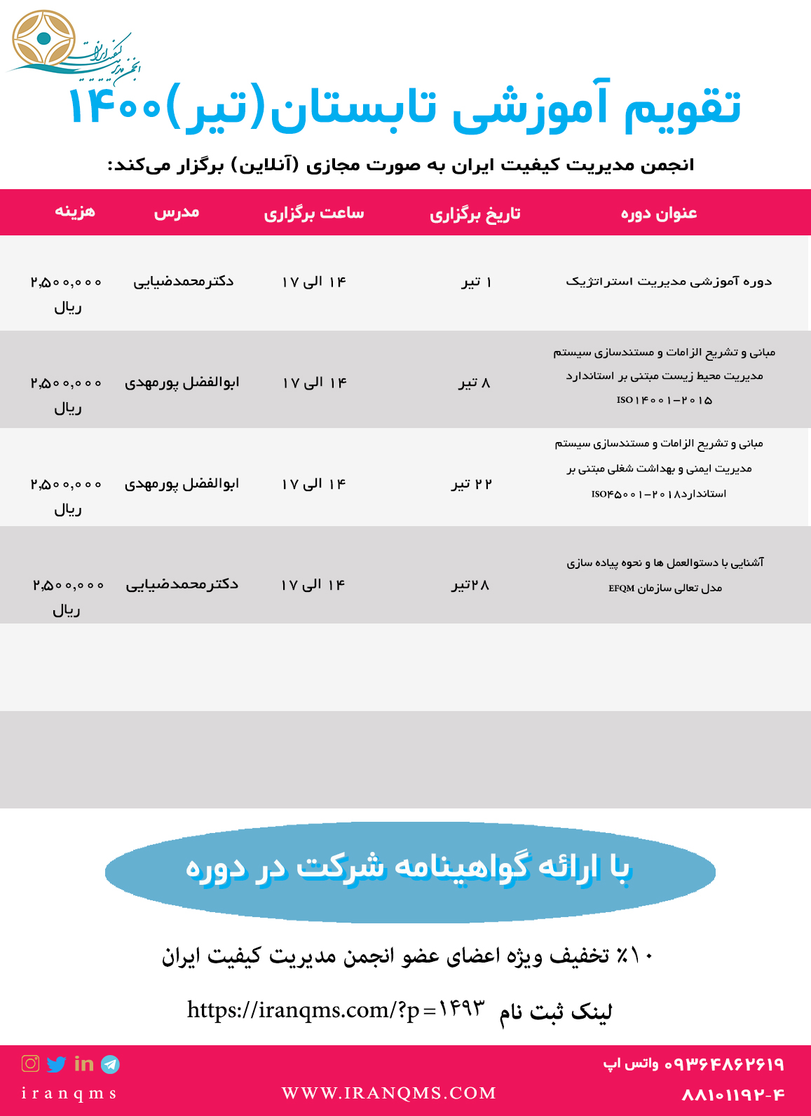 اخباراخبار آموزش تقویم آموزشی در تیرماه 1400 انجمن مدیریت کیفیت ایران به روز رسانی شده در 26 ژوئن 2021 0 به اشتراک گذاری فرم آموزش فیلد های "*" اجباری هستند عنوان دوره آموزشی*نام*نام خانوادگی*کدملی*نام شرکت/سازمان*پست سازمانی*رشته و میزان تحصیلات*تلفن همراه (واتس اپ)*ایمیل* آدرسپرداخت شهریه دوره*2/750/000 تومانتوجه: با توجه به نوع دوره انتخابی شهریه را براساس مبلغ ذکر شده که با احتساب مالیات بر ارزش افزوده محاسبه شده است انتخاب و پرداخت نمایید. * در صورت درخواست فاکتور رسمی باید با دبیرخانه 88101192 تماس حاصل فرمایید.مجموع 0 به اشتراک گذاری WhatsAppپست الکترونیکLinkedinTelegram