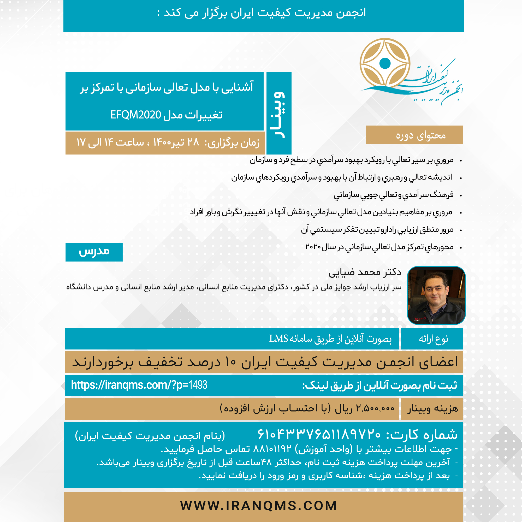 به اطلاع میرساند انجمن مدیریت کیفیت ایران در نظر دارد وبینار آموزشی آنلاین با عنوان ” آشنايي با مدل تعالي سازماني با تمركز بر تغييرات مدل EFQM 2020” در تاریخ 28 تیر 1400 بصورت مجازی برگزار نماید.