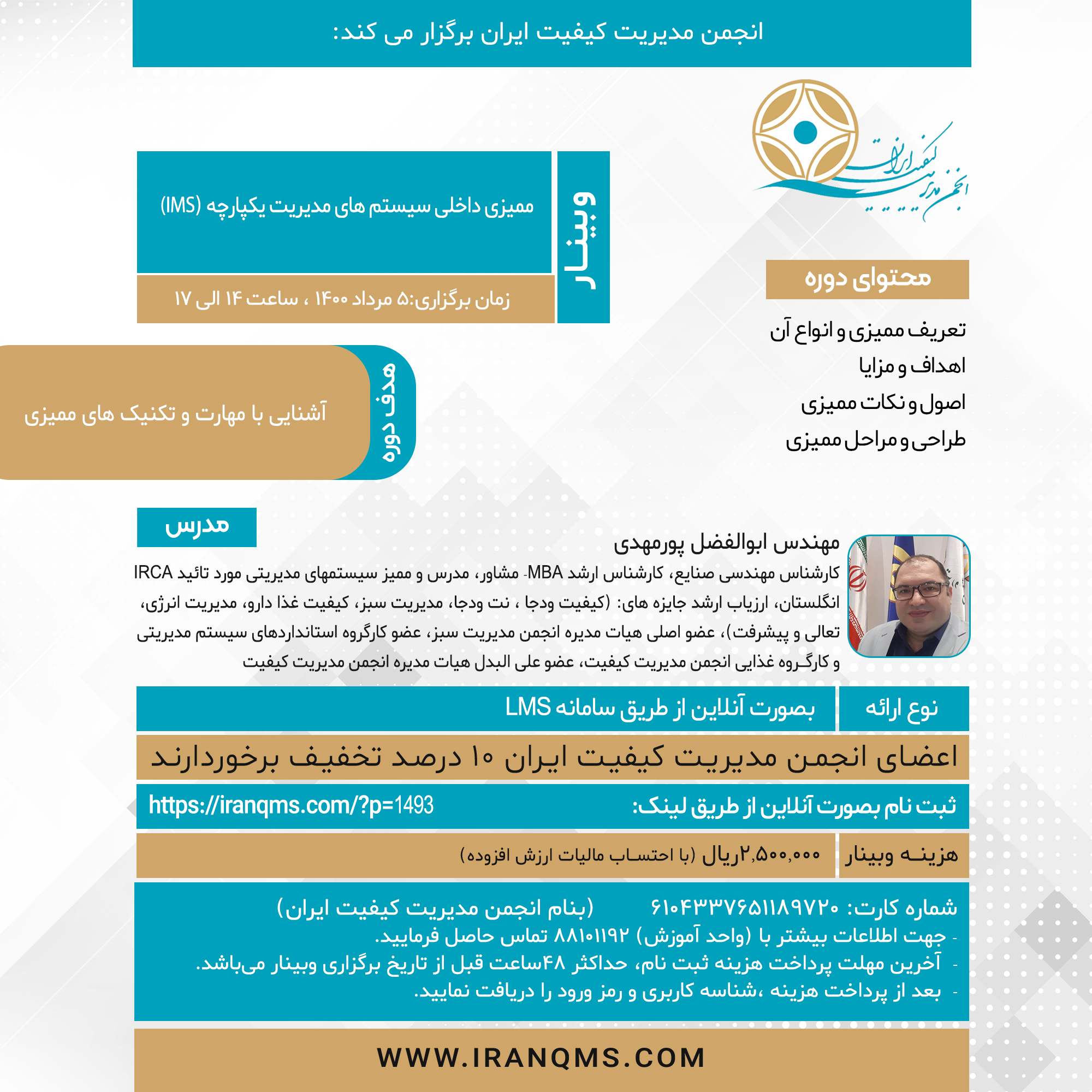 به اطلاع میرساند انجمن مدیریت کیفیت ایران در نظر دارد وبینار آموزشی آنلاین با عنوان ” مميزی داخلی سيستمهای مديريت يکپارچه ( IMS )“ با هدف آشنايی با مهارت و تکنيک های مميزی در تاریخ 5 مرداد1400 بصورت مجازی برگزار نماید.