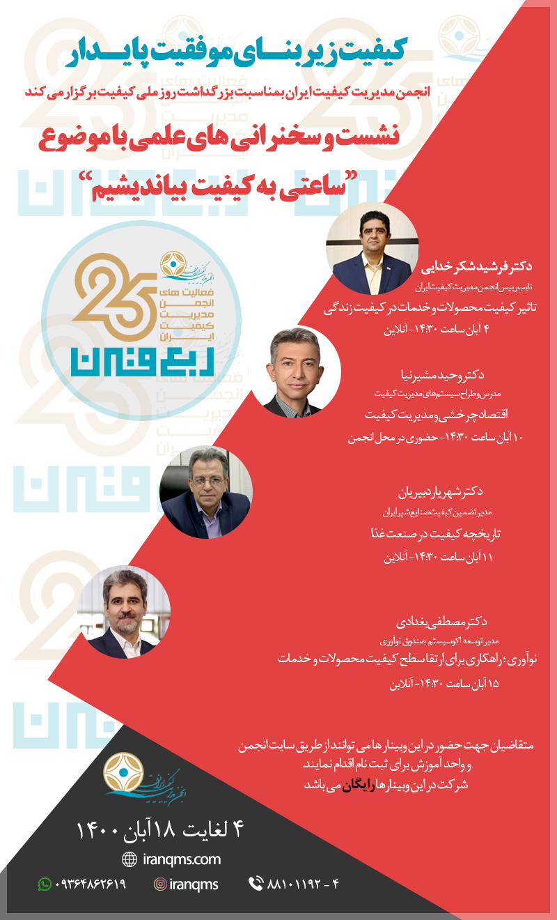 انجمن مدیریت کیفیت ایران در نظر دارد به مناسبت بزرگداشت روز ملی کیفیت در آبان ماه1400، سلسله نشست ها و سخنرانی های علمی با بررسی موضوعات روز کیفیت با عنوان “ساعتی به کیفیت بیاندیشیم” با حضور متخصصان,کارشناسان و صاحبنظران سیستم مدیریت کیفیت به صورت مجازی در سامانه LMS و رایگان برگزار نماید. علاقمندان جهت حضور در این وبینار ها می توانند از طریق تکمیل فرم زیر و یا با شماره تماس واحد آموزش 4-88101192 برای ثبت نام اقدام نمایند.