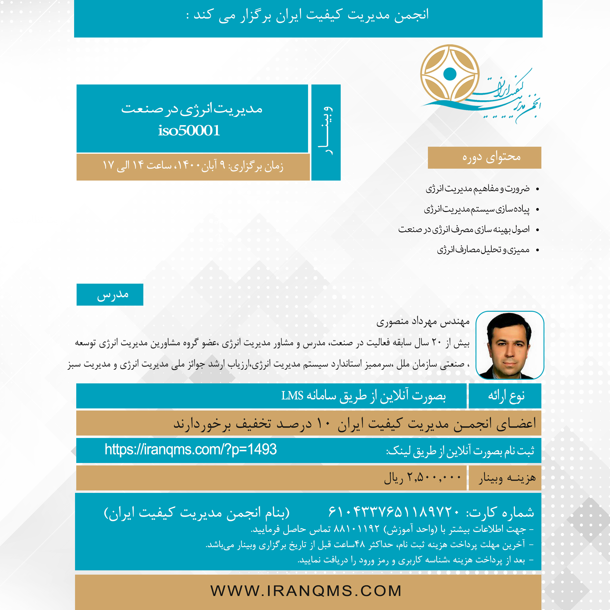 شعبه شرکت نفت بنام انجمن مدیریت کیفیت ایران شماره کارت: 6104337651189720 **اعضای انجمن از 10 درصد تخفیف برخوردار می باشند. همراه با اعطاء گواهينامه |