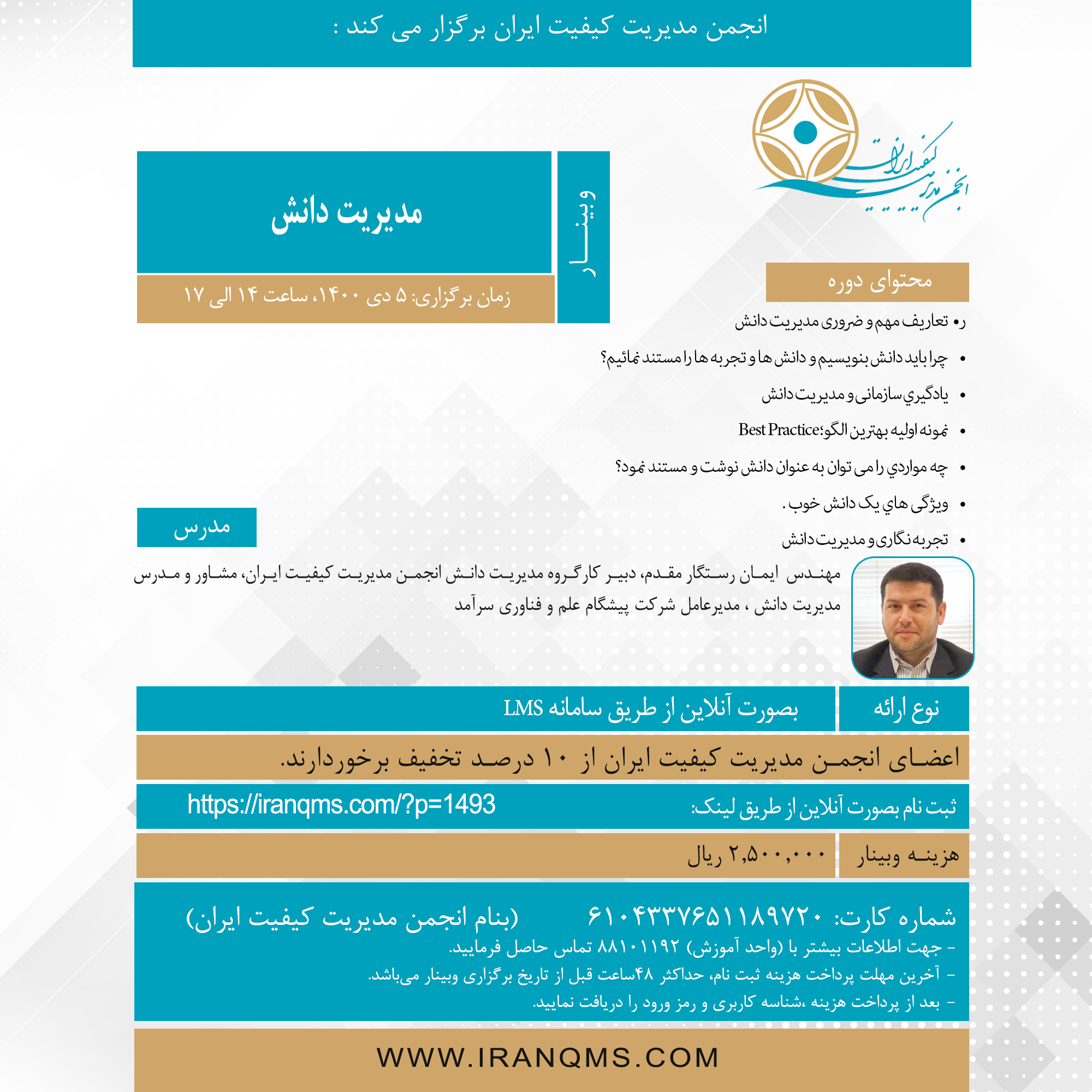 به اطلاع می رساند انجمن مدیریت کیفیت ایران در نظر دارد وبینار آموزشی آنلاین با عنوان “مدیریت دانش”در تاریخ 5 دی 1400 به صورت مجازی برگزار نماید