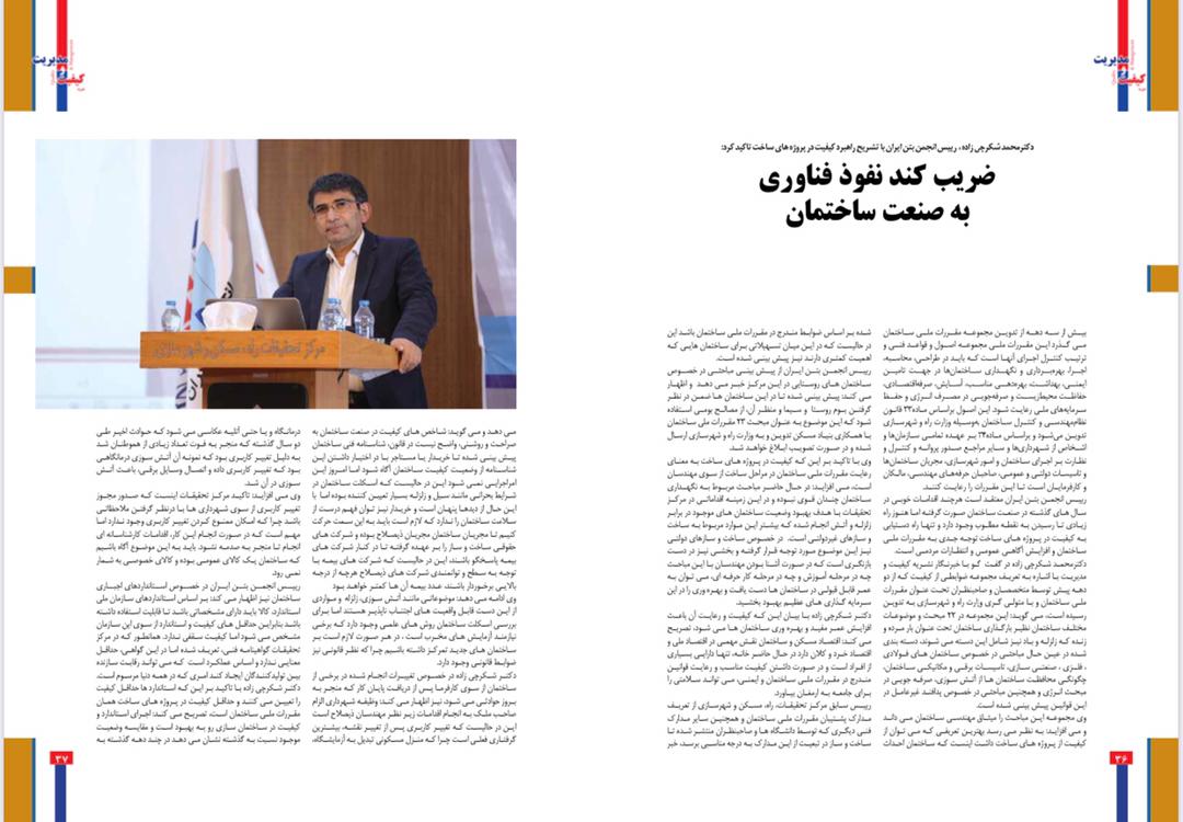 دکترمحمد شکرچی زاده در گفت گو با خبرنگار نشریه کیفیت و مدیریت با اشاره به تعریف مجموعه ضوابطی از کیفیت که از دو دهه پیش توسط متخصصان و صاحبنظران تحت عنوان مقررات ملی ساختمان و با متولی گری وزارت راه و شهرسازی به تدوین رسیده است، می گوید: این مجموعه در 22 مبحث و موضوعات مختلف ساختمان نظیر بارگذاری ساختمان تحت عنوان بار مرده و زنده که زلزله و باد نیز شامل این دسته می شوند، دسته بندی شده در عین حال مباحثی در خصوص ساختمان های فولادی ، فلزی ، صنعتی سازی، تاسیسات برقی و مکانیکی ساختمان، چگونگی محافظت ساختمان ها از آتش سوزی، صرفه جویی در مبحث انرژی و همچنین مباحثی در خصوص پدافند غیرعامل در این قوانین پیش بینی شده است.