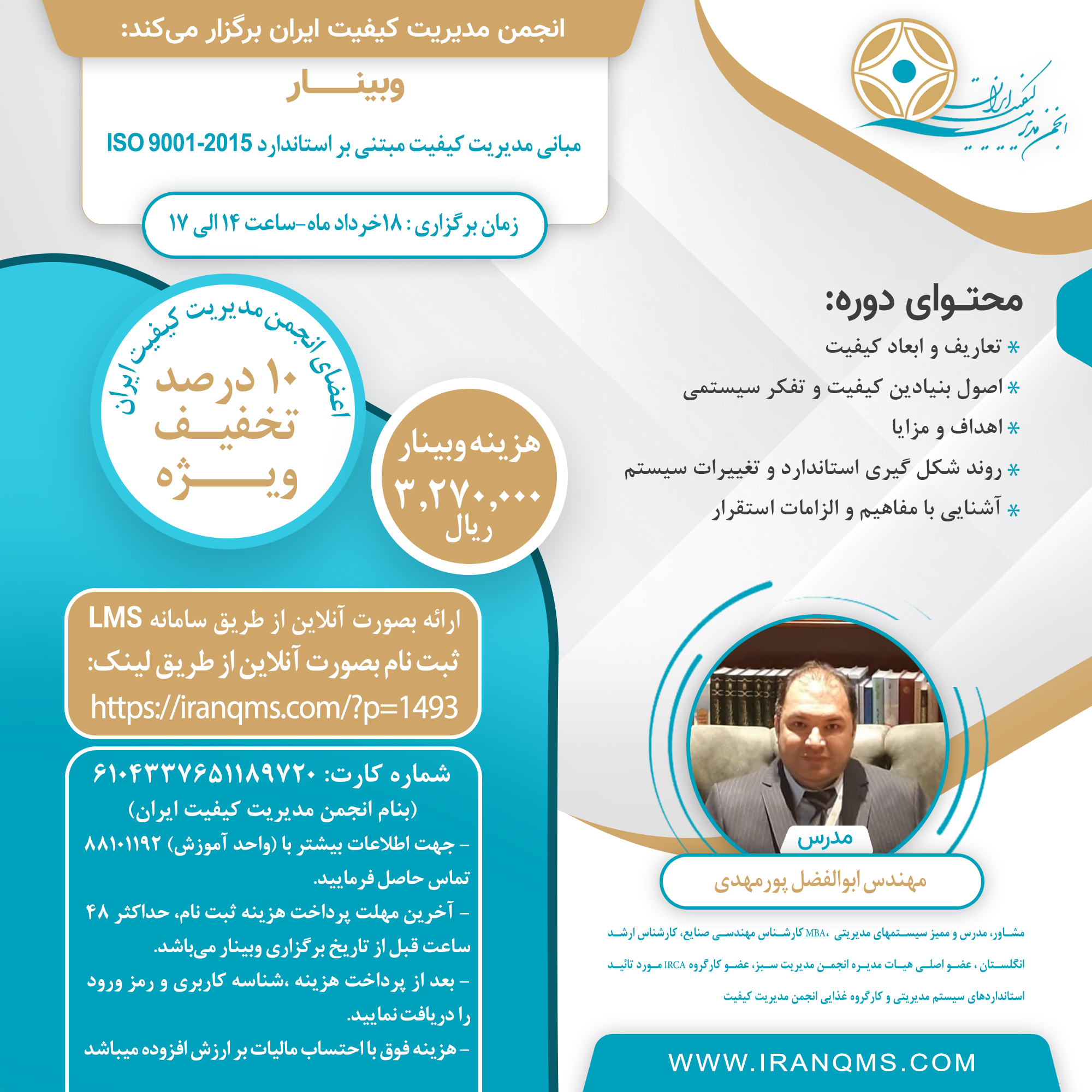 شعبه شرکت نفت بنام انجمن مدیریت کیفیت ایران شماره کارت: 6104337651189720 **اعضای انجمن از 10 درصد تخفیف برخوردار می باشند. همراه با اعطاء گواهينامه |