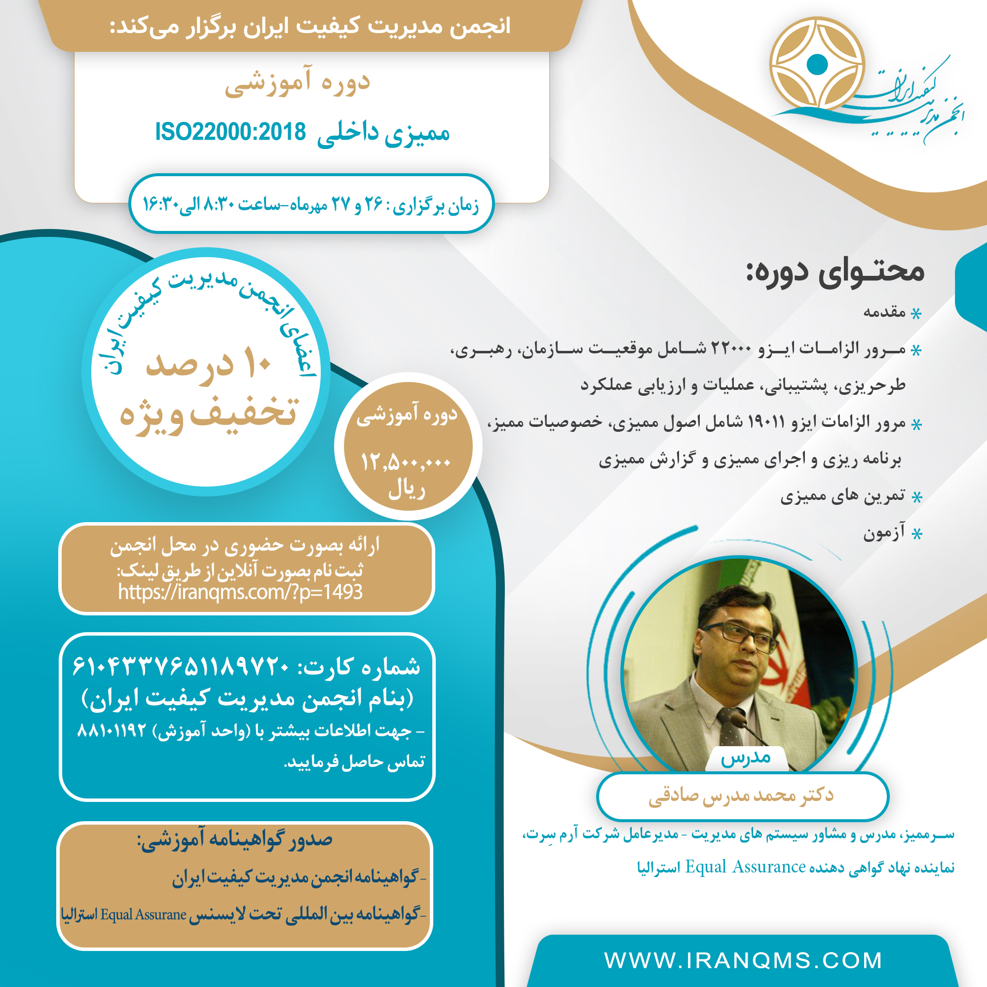 به اطلاع میرساند انجمن مدیریت کیفیت ایران در نظر دارد دوره آموزشی با عنوان “ممیزی داخلی ISO22000:2018“ در تاریخ 26 و 27 مهر1401 با ارائه گواهینامه آموزشی انجمن مدیریت کیفیت ایران و گواهینامه بین المللی تحت لایسنس EqualAssurance استرالیا ؛ بصورت حضوری در محل انجمن برگزار نماید.