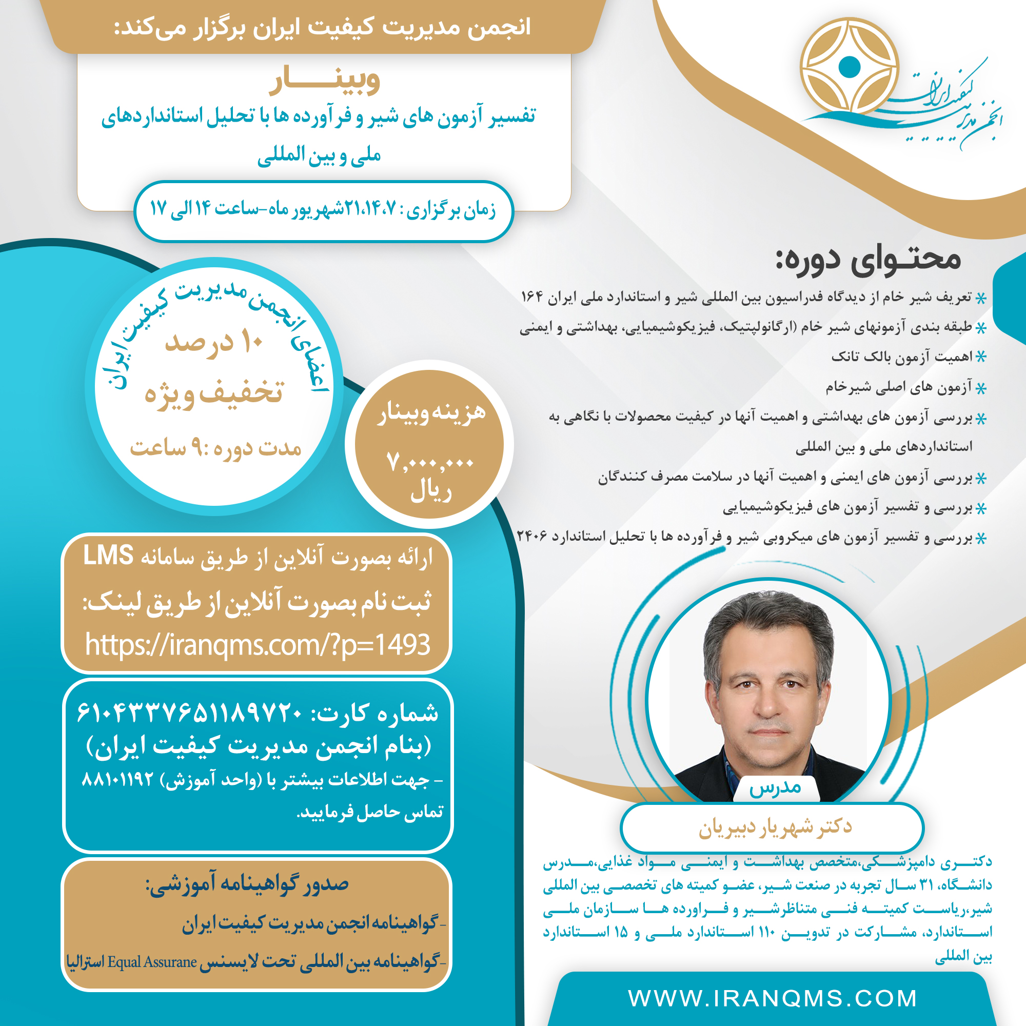 به اطلاع میرساند انجمن مدیریت کیفیت ایران در نظر دارد وبینار آموزشی با عنوان ” تفسیر آزمون های شیر و فرآورده ها با تحلیل استاندارهای ملی و بین المللی” در تاریخ 21،14،7 شهریور 1401 بصورت مجازی برگزار نماید.
