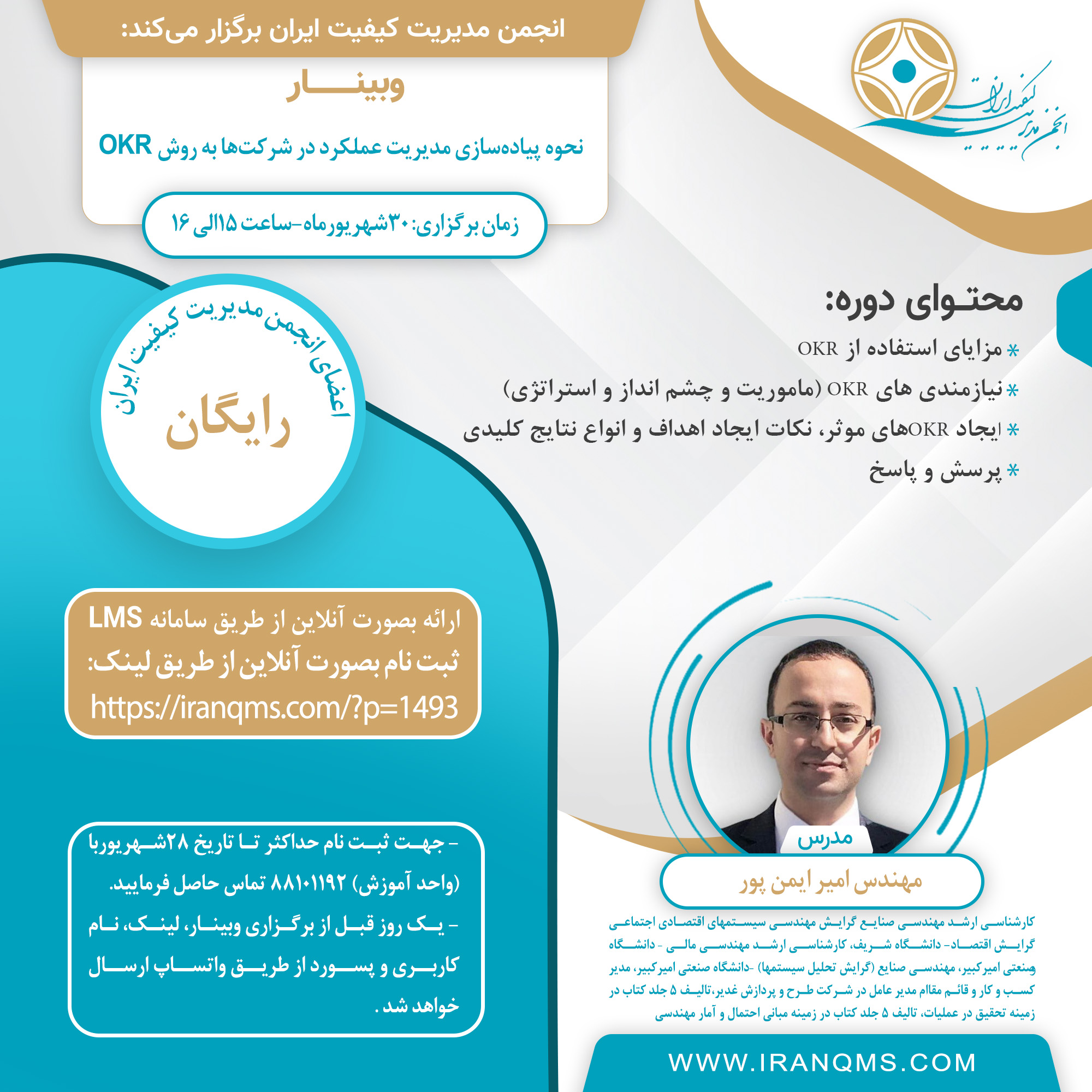 به اطلاع میرساند انجمن مدیریت کیفیت ایران در نظر دارد وبینار آموزشی با عنوان ” نحوه پیاده سازی مدیریت عملکرد در شرکت ها به روش OKR“ در تاریخ 30 شهریور 1401 بصورت مجازی برگزار نماید.