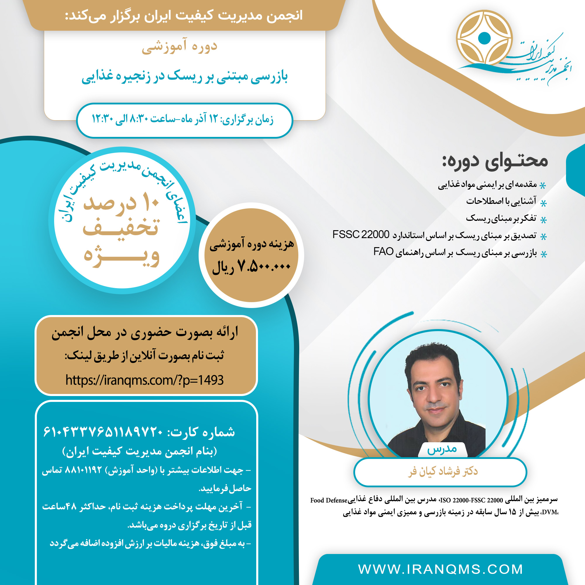 به اطلاع میرساند انجمن مدیریت کیفیت ایران در نظر دارد دوره آموزشی با عنوان “ بازرسی مبتنی بر ریسک در زنجیره غذایی “ در تاریخ 12 آذر 1401 با ارائه گواهینامه آموزشی انجمن مدیریت کیفیت ایران ؛ بصورت حضوری در محل انجمن برگزار نماید.