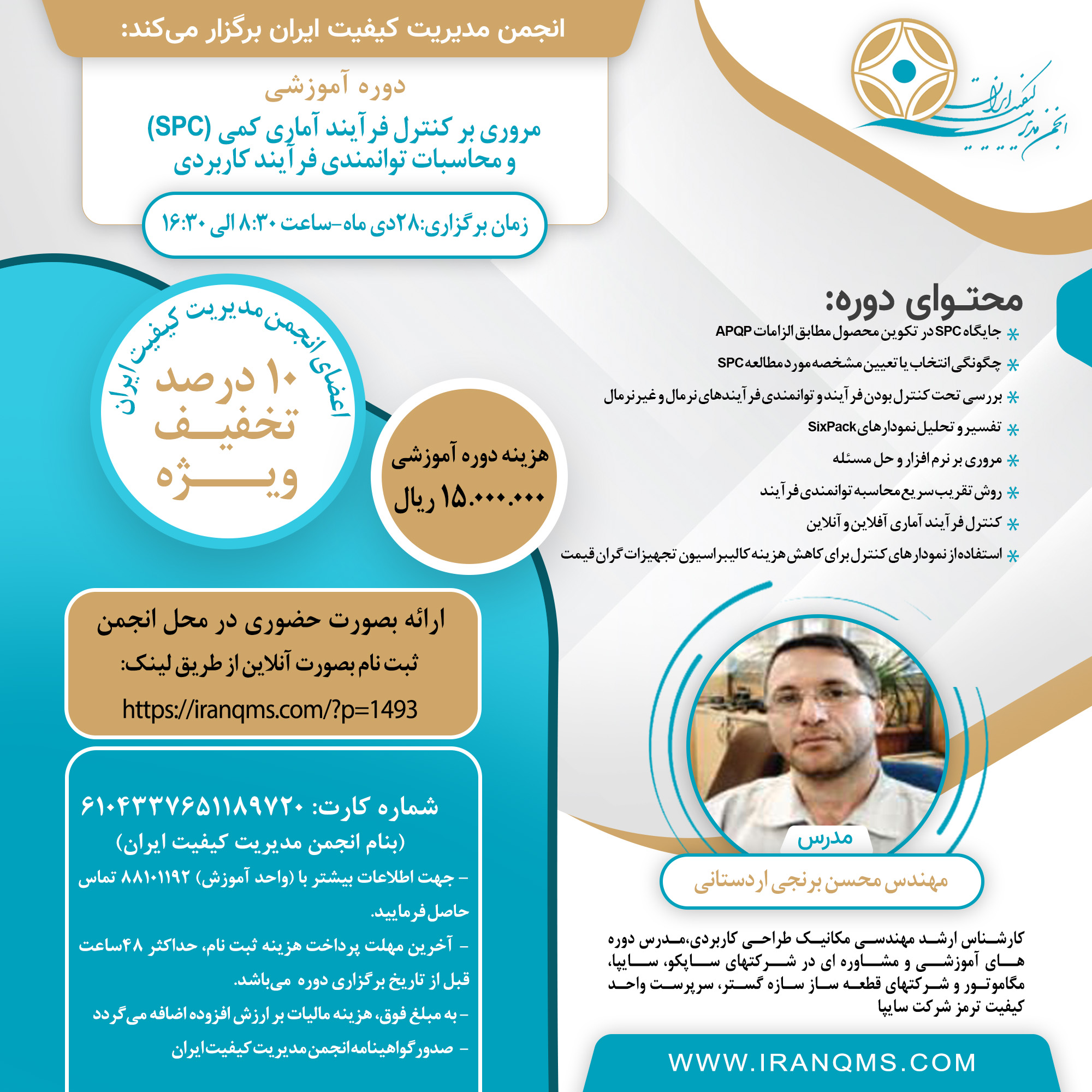 به اطلاع میرساند انجمن مدیریت کیفیت ایران در نظر دارد دوره آموزشی با عنوان “مروري بر كنترل فرآيند آماري كمي (SPC) و محاسبات توانمندي فرآيند كاربردي” در تاریخ 28 دی 1401 با ارائه گواهینامه آموزشی انجمن مدیریت کیفیت ایران ؛ بصورت حضوری در محل انجمن برگزار نماید.