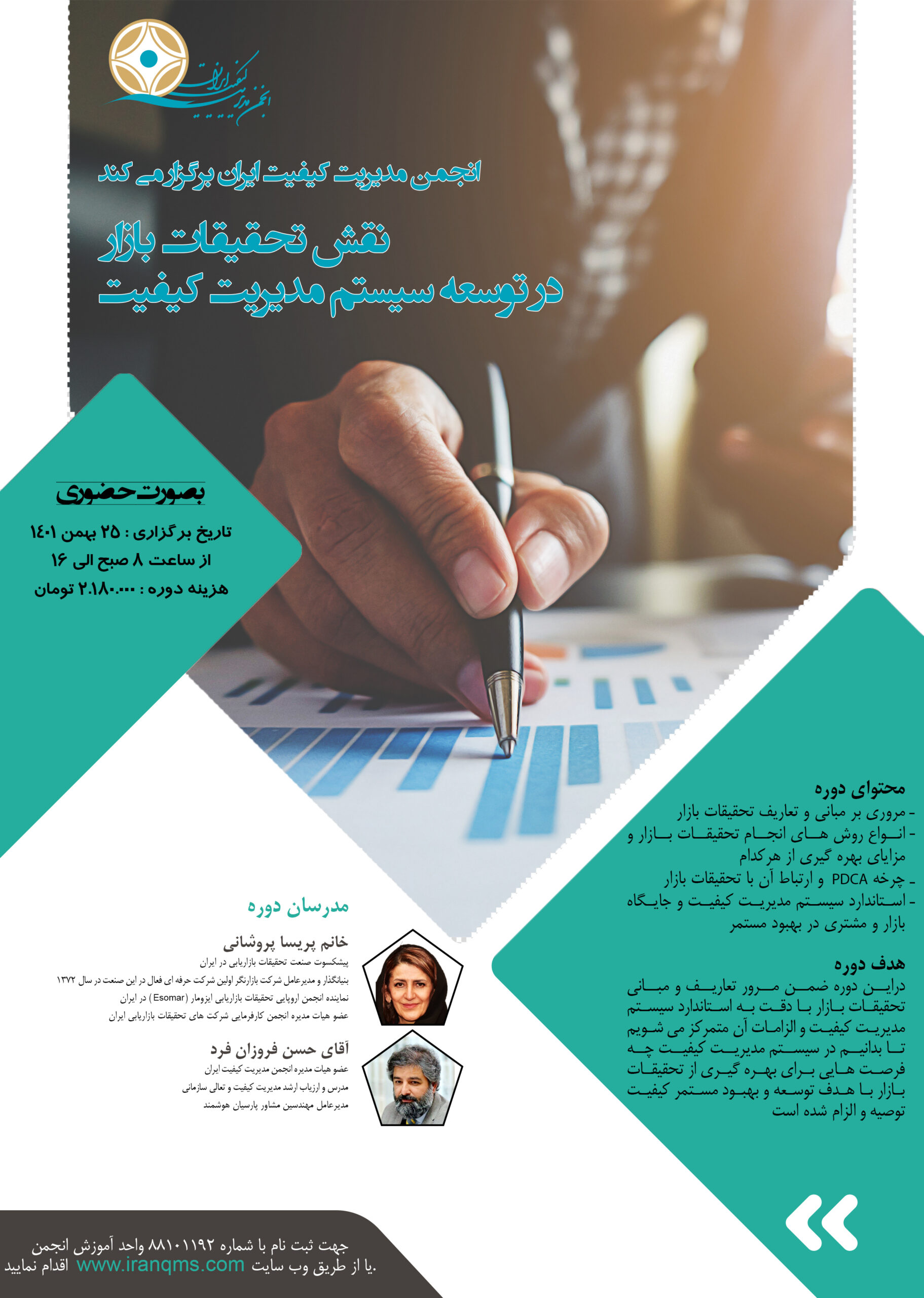 انجمن مدیریت کیفیت ایران ضمن مرور تعاریف و مبانی تحقیقات بازار و دقت به استاندارد سیستم مدیریت کیفیت و الزامات تمرکز می نماید تا بدانیم در سیستم مدیریت کیفیت چه فرصت هایی برای بهره گیری از تحقیات بازار با هدف توسعه و بهبود مستمر کیفیت توصیه و الزام شده است بدین منظور دوره آموزشی با عنوان “نقش تحقیقات بازار در توسعه سیستم مدیریت کیفیت” در تاریخ 25 بهمن 1401 با ارائه گواهینامه آموزشی انجمن مدیریت کیفیت ایران ؛ بصورت حضوری در محل انجمن برگزار می شود.