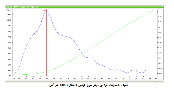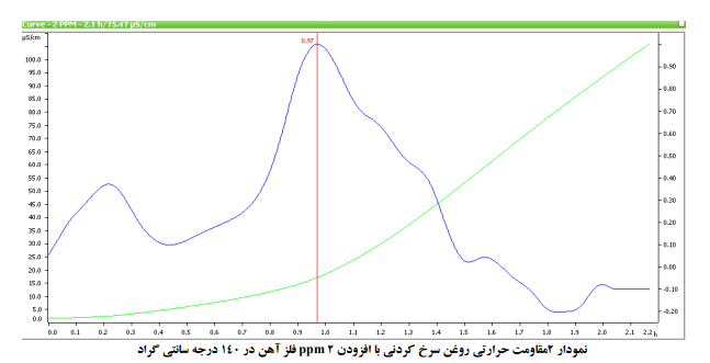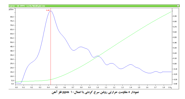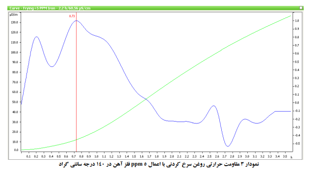 بمنظور بررسی کاهش مقاومت حرارتی روغن سرخ کردنی بیرنگ نشده از طریق افزایش میزان فلز آهن از 2 تا 10 پی پی ام توسط دستگاه مقاومت سنج حرارتی در درمای 140 درجه سانتی گراد انجام شد. لازم به ذکر است دمای 110 درجه سانتی گراد مرجع استاندارد ملی ایران برای تعیین مقاومت حرارتی روغن خوراکی است که با ضرب عدد 8 بر عدد خروجی در دمای 140 درجه سانتی گراد مقدار در 110 درجه سانتی گراد گزارش میشود.