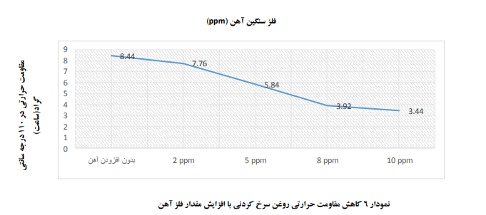 نمودارهای2 الی 5 کاهش مقاومت حرارتی روغن سرخ کردنی بی رنگ نشده با افزودن فلز آهن با مقدار 2 الی 10 پی پی ام در دمای 140 درجه سانتی گراد و دمیدن هوا به مقدار 20 لیتر بر ساعت به نمونه روغن نشان میدهد. همچنین نمودار شماره 1 مقاومت حرارتی بدون افزودن فلز آهن نشان داده شده است که نمودار 6 بصورت کامل کاهش مقاومت حرارتی را در دمای 110 درجه سانتی گراد نشان میدهد. میتوان نتیجه گرفت مقاومت حرارتی از 2 الی 10 پی پی ام به ترتیب کاهش 8 درصد، 8.30 درصد،5.53 درصد و 3.59 درصد کاهش را نشان میدهد که اهمیت حضور فلز سنگین آهن را نشان میدهد که باعث آغاز فرآیند اکسیداسیون روغن سرخ کردنی میشود.
