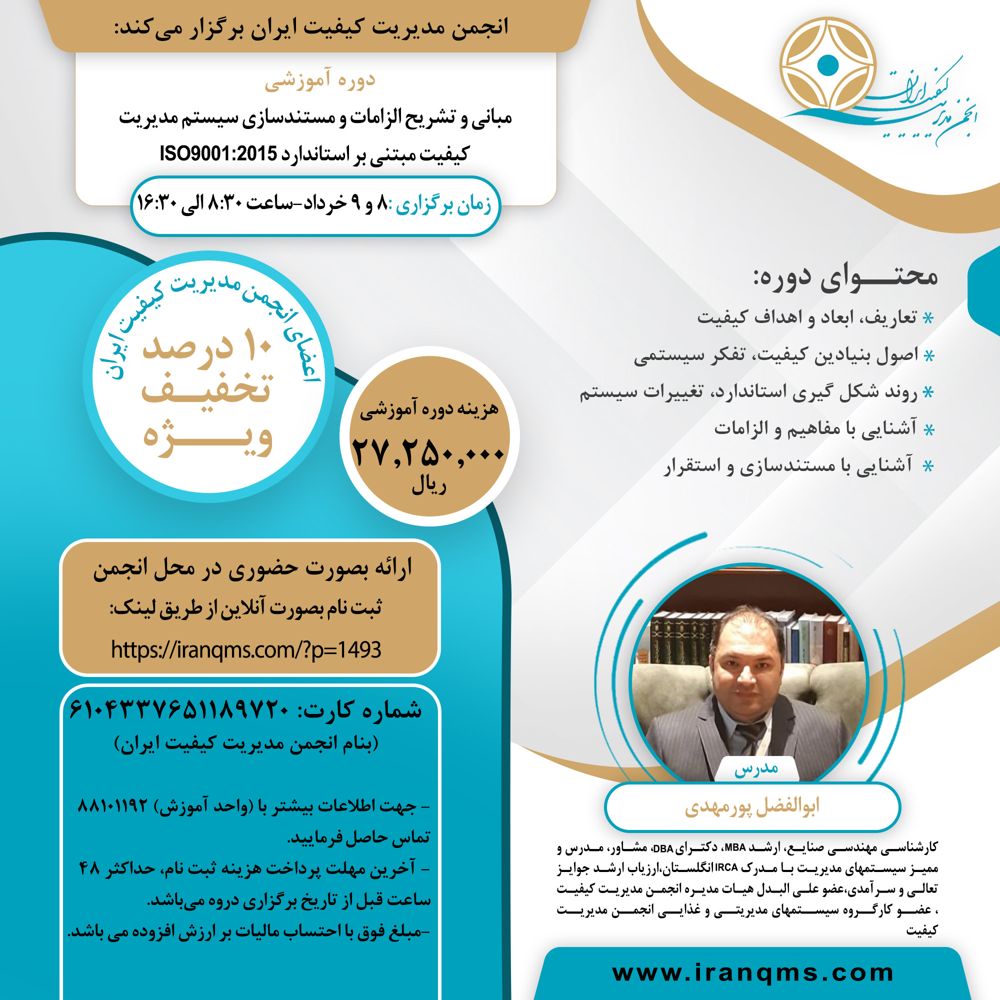 به اطلاع میرساند انجمن مدیریت کیفیت ایران در نظر دارد دوره آموزشی با عنوان “ مبانی و تشریح الزامات و مستندسازی سیستم مدیریت کیفیت مبتنی بر استاندارد ISO9001:2015“ در تاریخ 8 و 9 خرداد 1402 با ارائه گواهینامه آموزشی انجمن مدیریت کیفیت ایران ؛ بصورت حضوری در محل انجمن برگزار نماید.