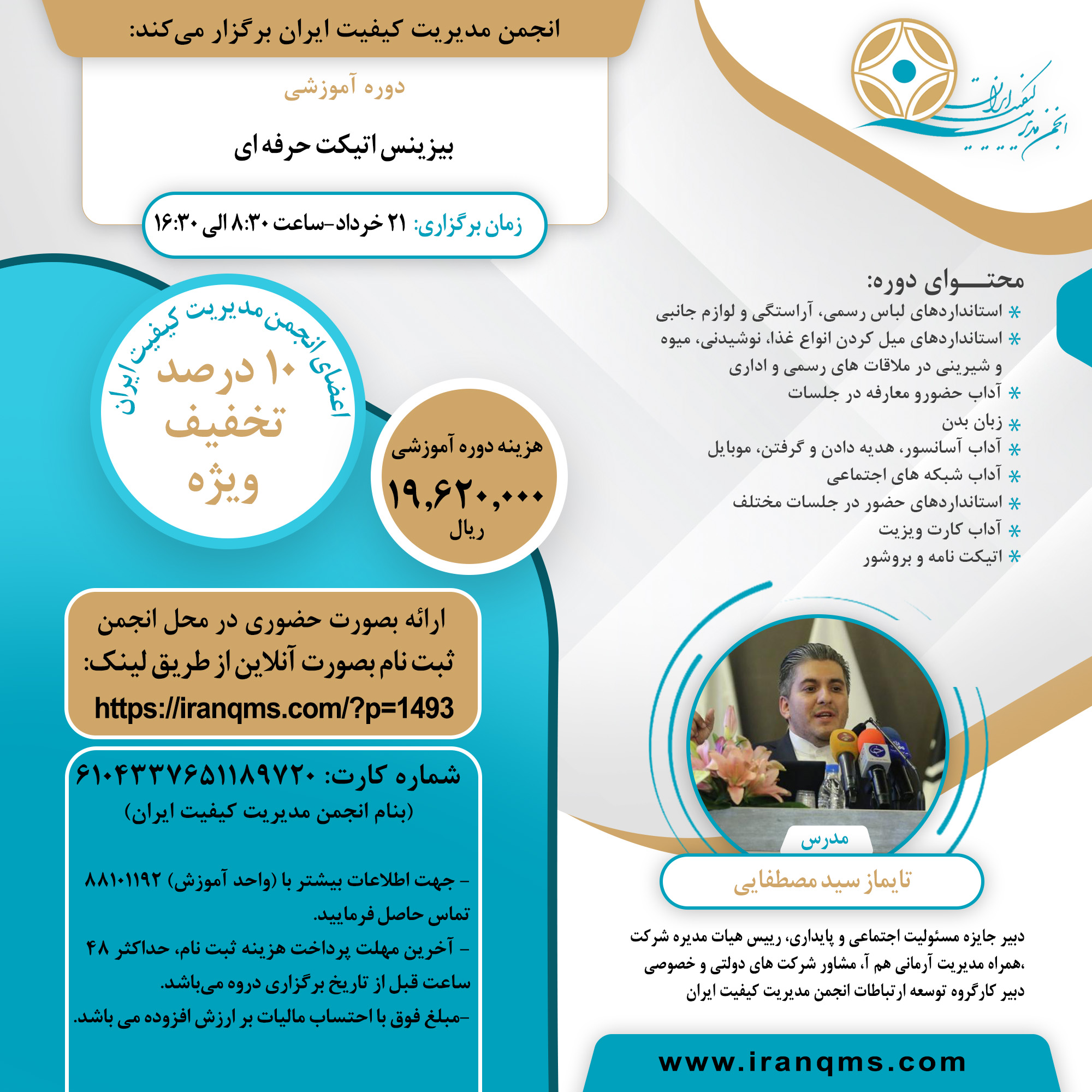 به اطلاع میرساند انجمن مدیریت کیفیت ایران در نظر دارد دوره آموزشی با عنوان “ بیزینس اتیکت حرفه ای“ در تاریخ 21 خرداد 1402 با ارائه گواهینامه آموزشی انجمن مدیریت کیفیت ایران ؛ بصورت حضوری در محل انجمن برگزار نماید.