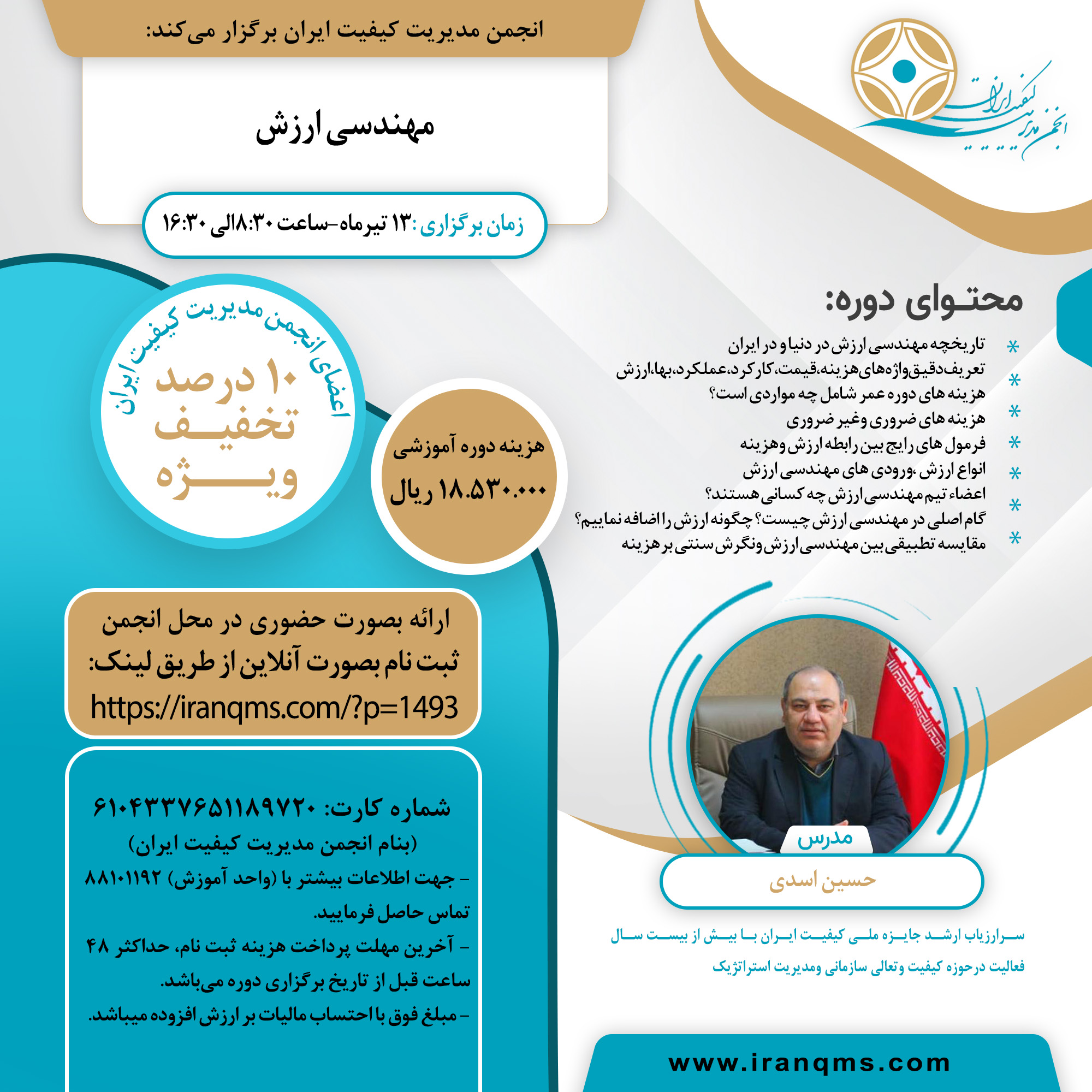 به اطلاع میرساند انجمن مدیریت کیفیت ایران در نظر دارد دوره آموزشی با عنوان “ مهندسی ارزش” در تاریخ 13 تیر 1402 با ارائه گواهینامه آموزشی انجمن مدیریت کیفیت ایران ؛ بصورت حضوری در محل انجمن برگزار نماید.