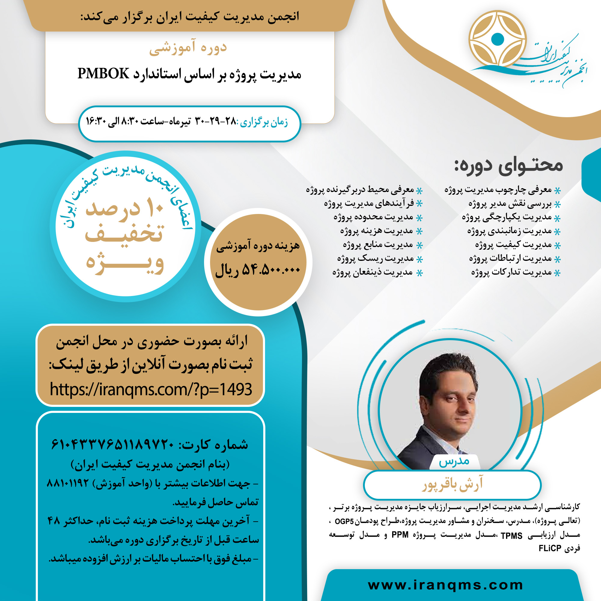 در همین راستا انجمن مدیریت کیفیت ایران در نظر دارد دوره آموزشی با عنوان “ مدیریت پروژه بر اساس استاندارد PMBOK “ در تاریخ 28-29-30 تیر 1402 طی سه روز با ارائه گواهینامه معتبر در محل انجمن برگزار نماید.که در صورت علاقمندی جهت ثبت نام اطلاعات دوره اعلام می شود.
