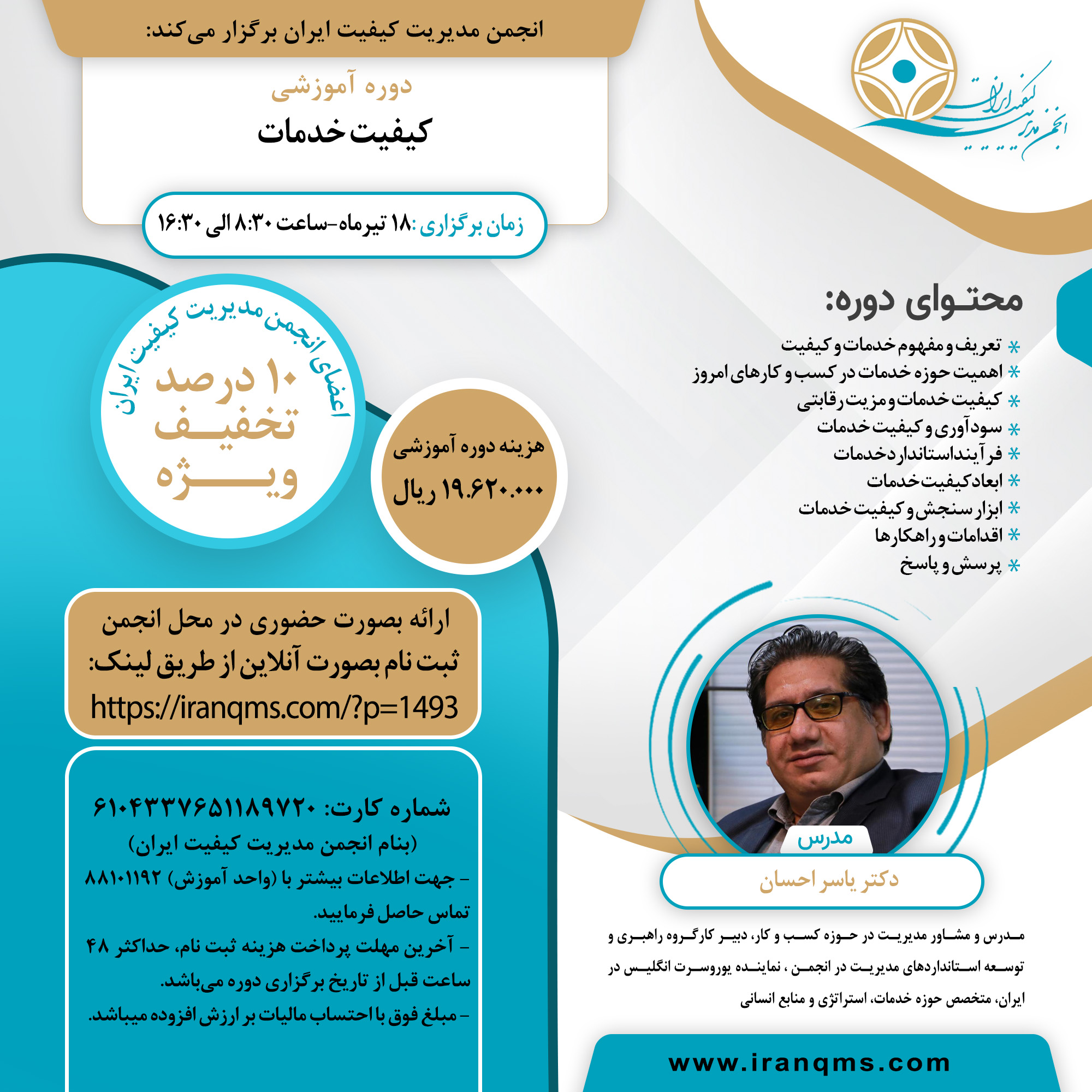 | مدرس: دکتر یاسر احسان،مدرس و مشاور مدیریت در حوزه کسب و کار،دبیر کارگروه راهبری و توسعه استانداردهای مدیریت در انجمن، نماینده یوروسرت انگلیس در ایران،متخصص حوزه خدمات، استراتژی و منابع انسانی | ||