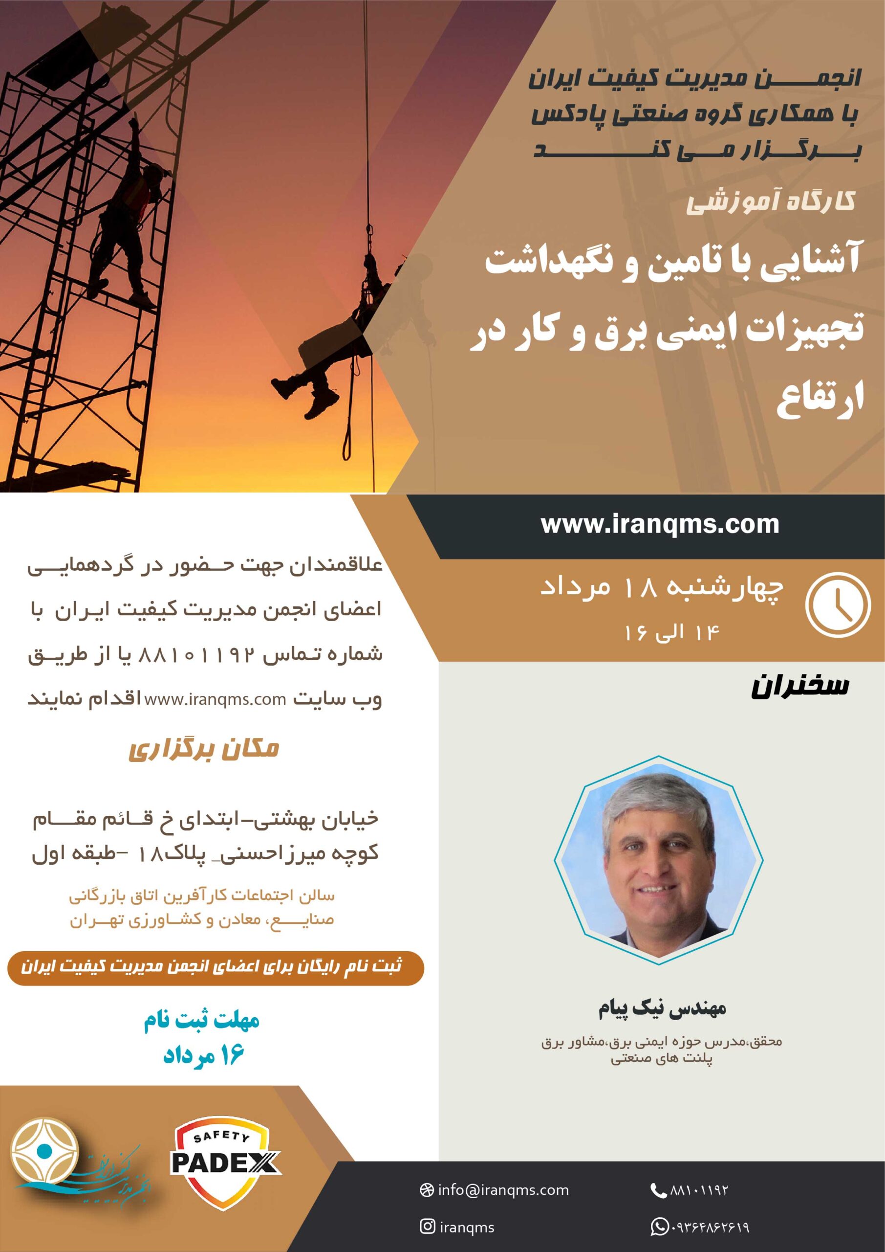 انجمن مدیریت کیفیت ایران در نظر دارد در راستای ارتقای کیفیت دانش ایمنی واحدهای HSE با همکاری گروه صنعتی پادکس نسبت به برگزاری کارگاه آموزشی نیم روزه” آشنایی با تامین و نگهداشت تجهیزات ایمنی برق و کار در ارتفاع” با تدریس آقای نیک پیام محقق و مدرس حوزه ایمنی برق را در روز چهارشنبه مورخ 18 مرداد 1402 در محل اتاق تهران از ساعت 14:30 الی 17 برگزار نماید.
