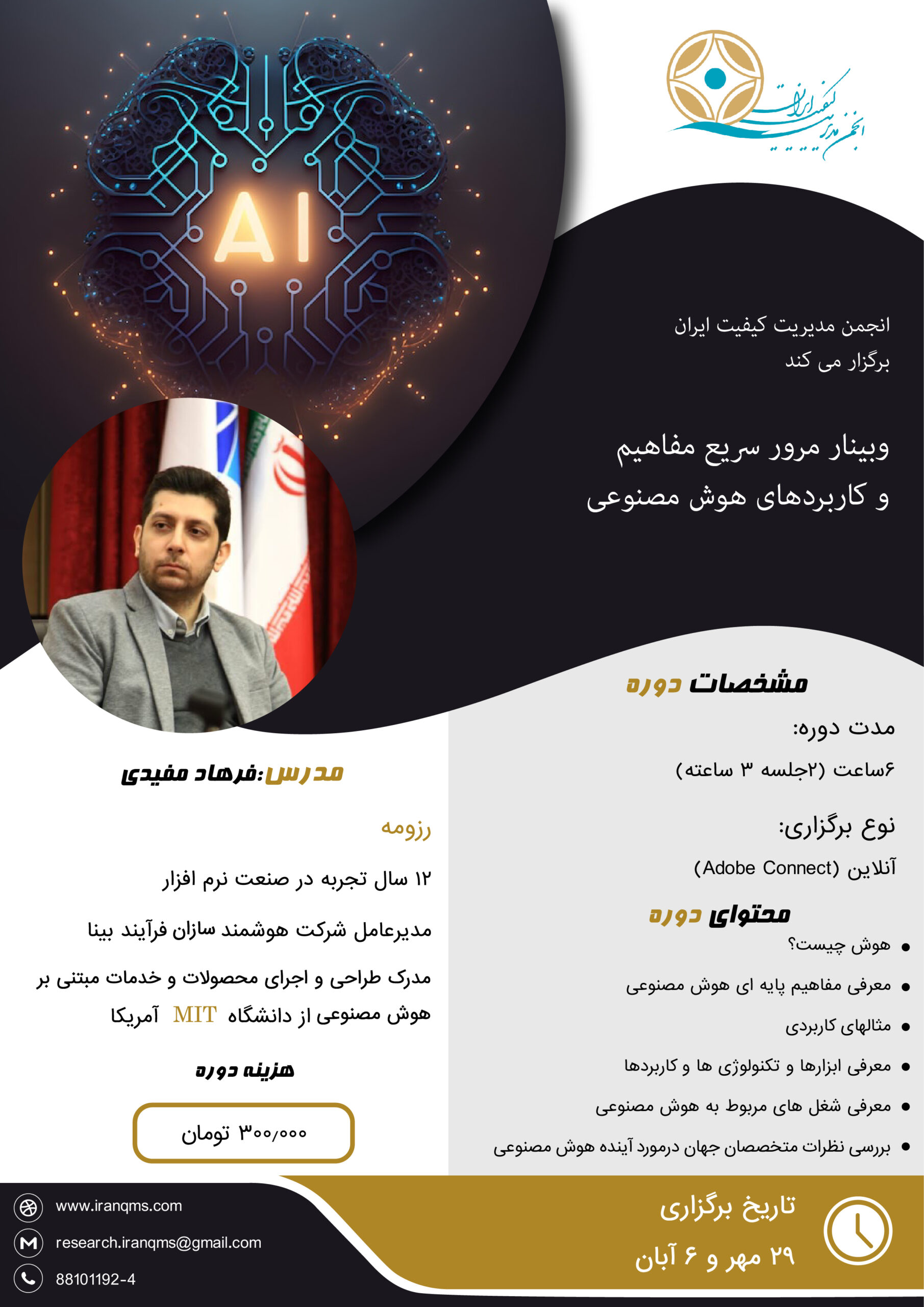 به اطلاع میرساند انجمن مدیریت کیفیت ایران در نظر دارد وبینار آموزشی با عنوان “ مرور سریع مفاهیم و کاربردهای هوش مصنوعی” در تاریخ 29 مهر و 6 آبان 1402 با ارائه گواهینامه آموزشی انجمن مدیریت کیفیت ایران ؛ بصورت آنلاین از طریق Adobe Connect برگزار نماید.