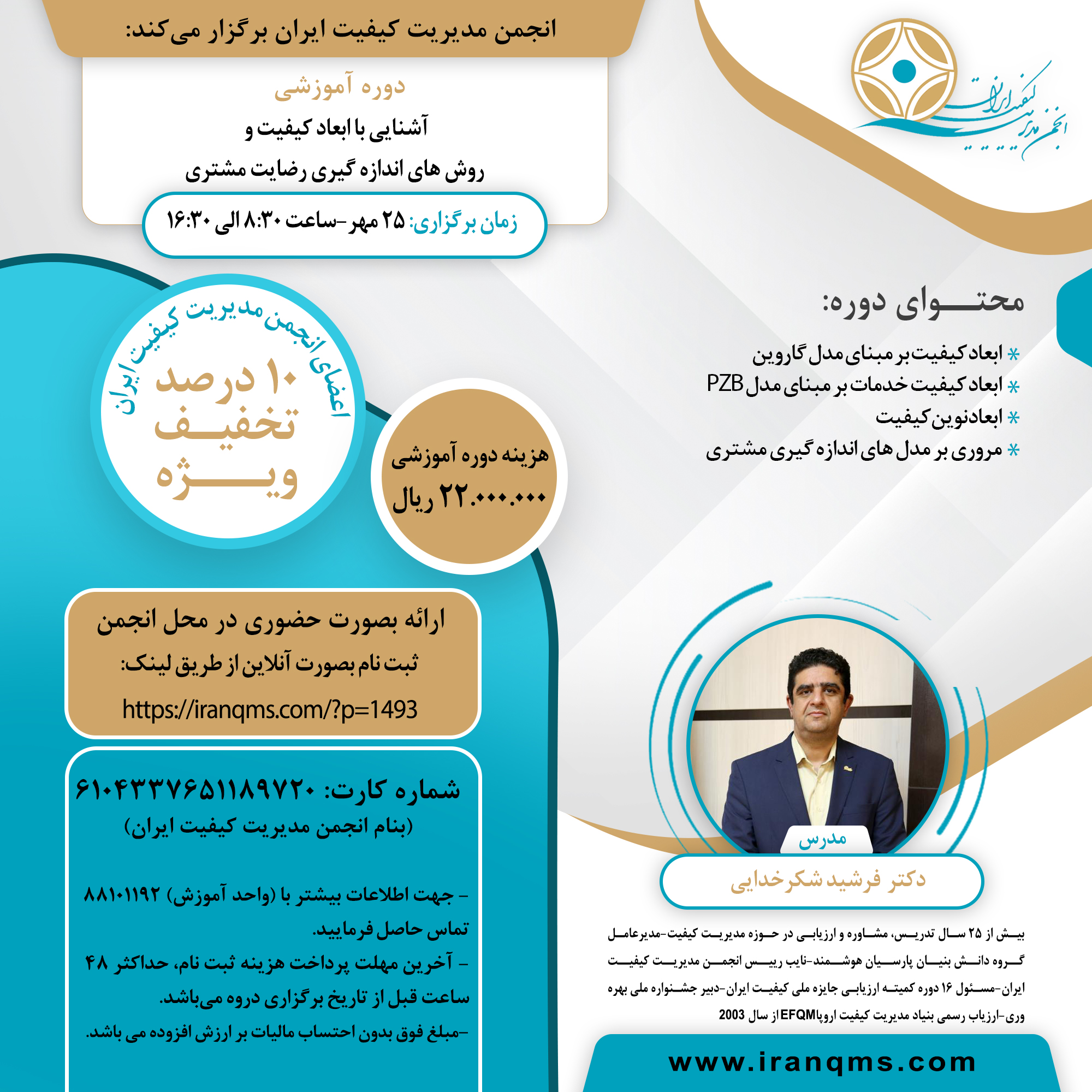 مدرس: دکتر فرشید شکرخدایی، بیش از 25 سال تدریس، مشاوره و ارزیابی در حوزه مدیریت کیفیت- مدیرعامل گروه دانش بنیان پارسیان هوشمند-نایب رییس انجمن مدیریت کیفیت ایران-مسئول 16 دوره کمیته ارزیابی جایزه ملی کیفیت ایران –دبیر جشنواره ملی بهره وری-ارزیاب رسمی بنیاد مدیریت کیفیت اروپا EFQM از سال 2003