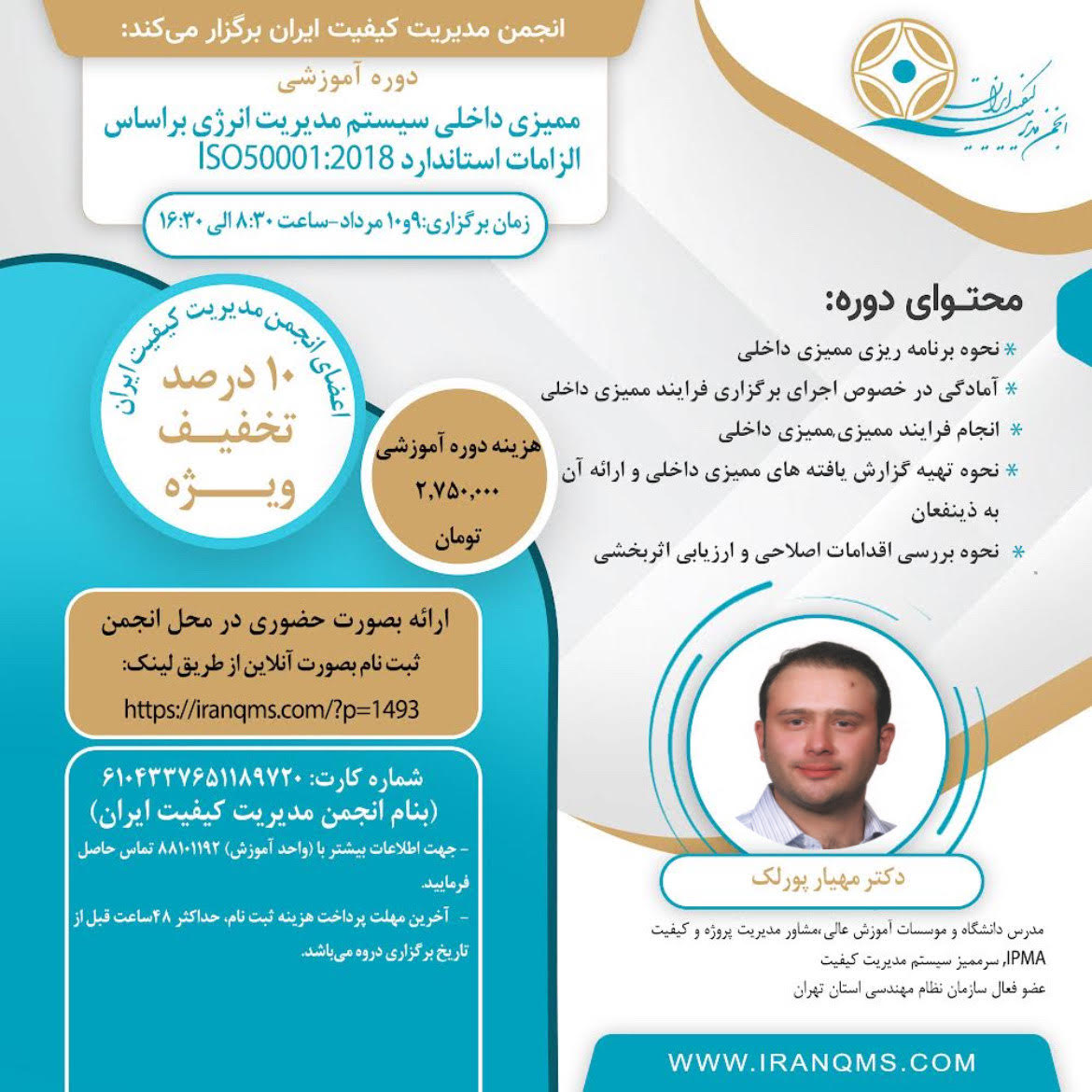 · مبلغ فوق با احتساب مالیات بر ارزش افزوده می باشد. · ثبت نام بصورت آنلاين از طريق لينک https://iranqms.com/?p=1493 |