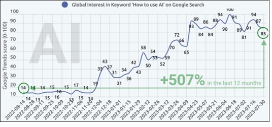 شکل1– افزایش 507 درصدی علاقمندی مردم به استفاده از AI در عرض 1 سال ( آگوست2022 تا اگوست2023 )