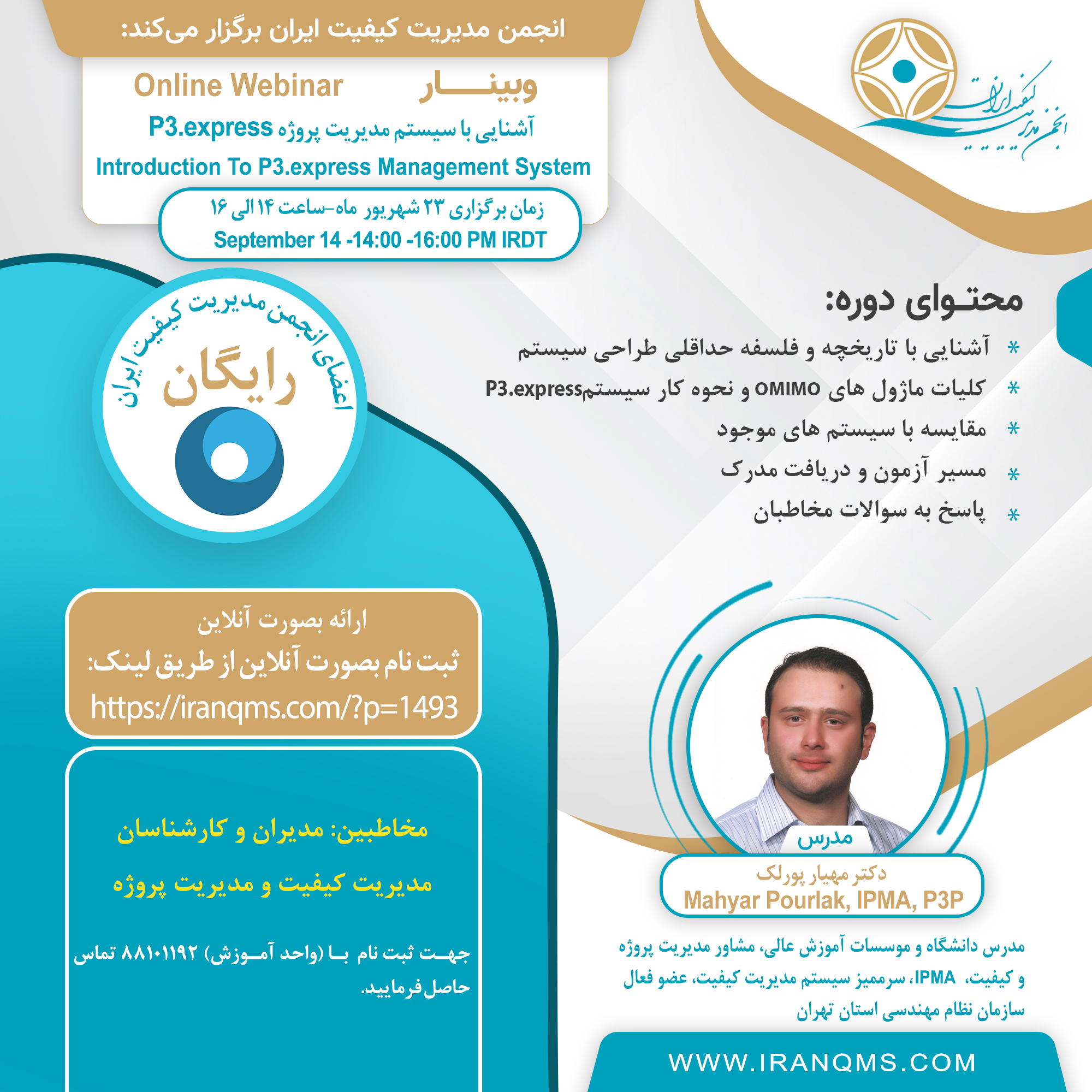 به اطلاع می رساند انجمن مدیریت کیفیت ایران در نظر دارد وبینار آموزشی برای مدیران و کارشناسان مدیریت کیفیت و مدیریت پروژه با عنوان“ آشنایی با سیستم مدیریت پروژه P3.express“در تاریخ 23 شهریور 1404 به صورت مجازی برگزار نماید.