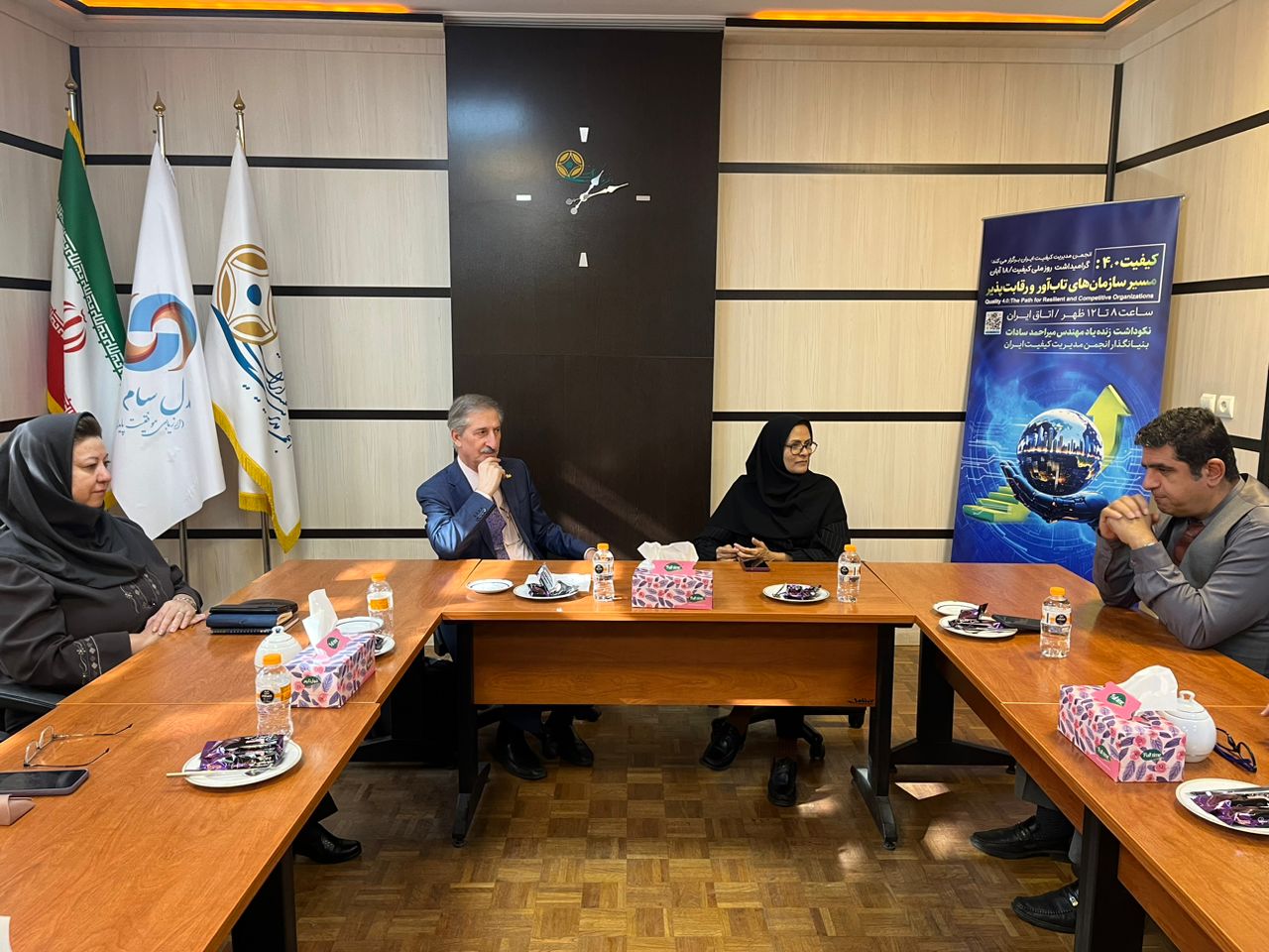 این جلسه با حضور خانم دکتر فرحناز قلاسی معاون تدوین و ترویج، خانم شادروانان کارشناس دفتر تدوین استانداردها، و از طرف انجمن، مهندس انتصاریان رئیس انجمن، خانم دکتر وفایی عضو هیأتمدیره، دکتر شکرخدایی نایبرئیس، دکتر حسن فروزانفرد رئیس کمیسیون حکمرانی اتاق تهران و عضو هیأتمدیره انجمن، و امیر حیدری دبیرکل انجمن مدیریت کیفیت ایران برگزار شد.